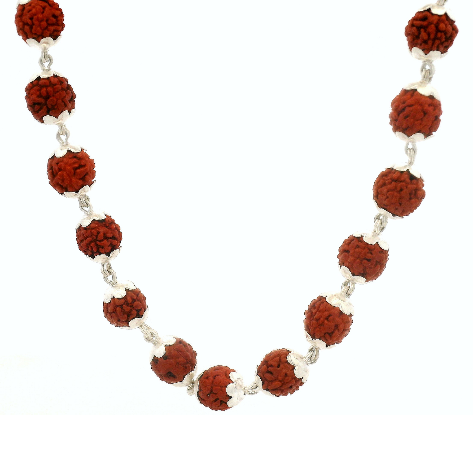 A sacred Rudraksha Mala Necklace with Silver Caps, designed to symbolize spirituality, protection, and positive energy.