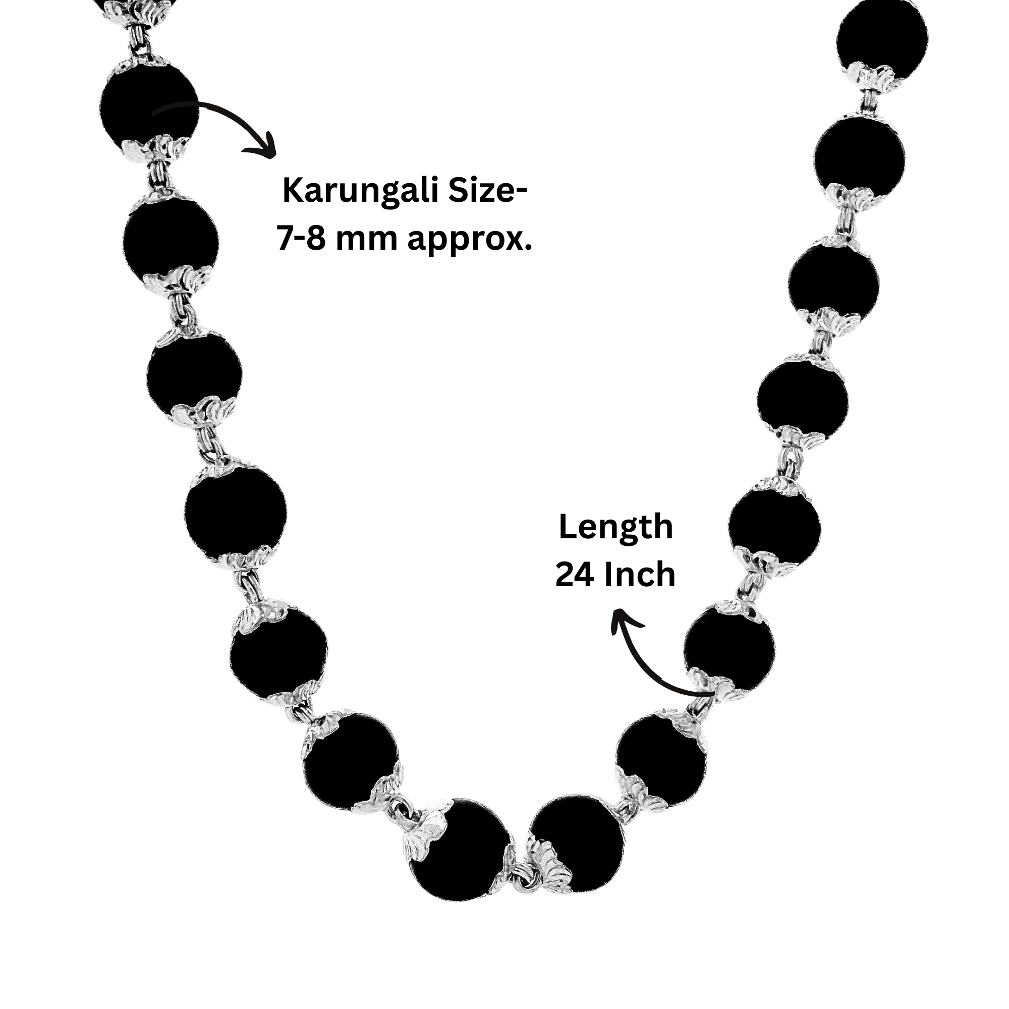 A sacred Karungali Mala Necklace with Silver Caps, designed to symbolize protection, grounding energy, and spiritual stability. The deep black Karungali beads paired with silver accents create a powerful and elegant spiritual accessory.