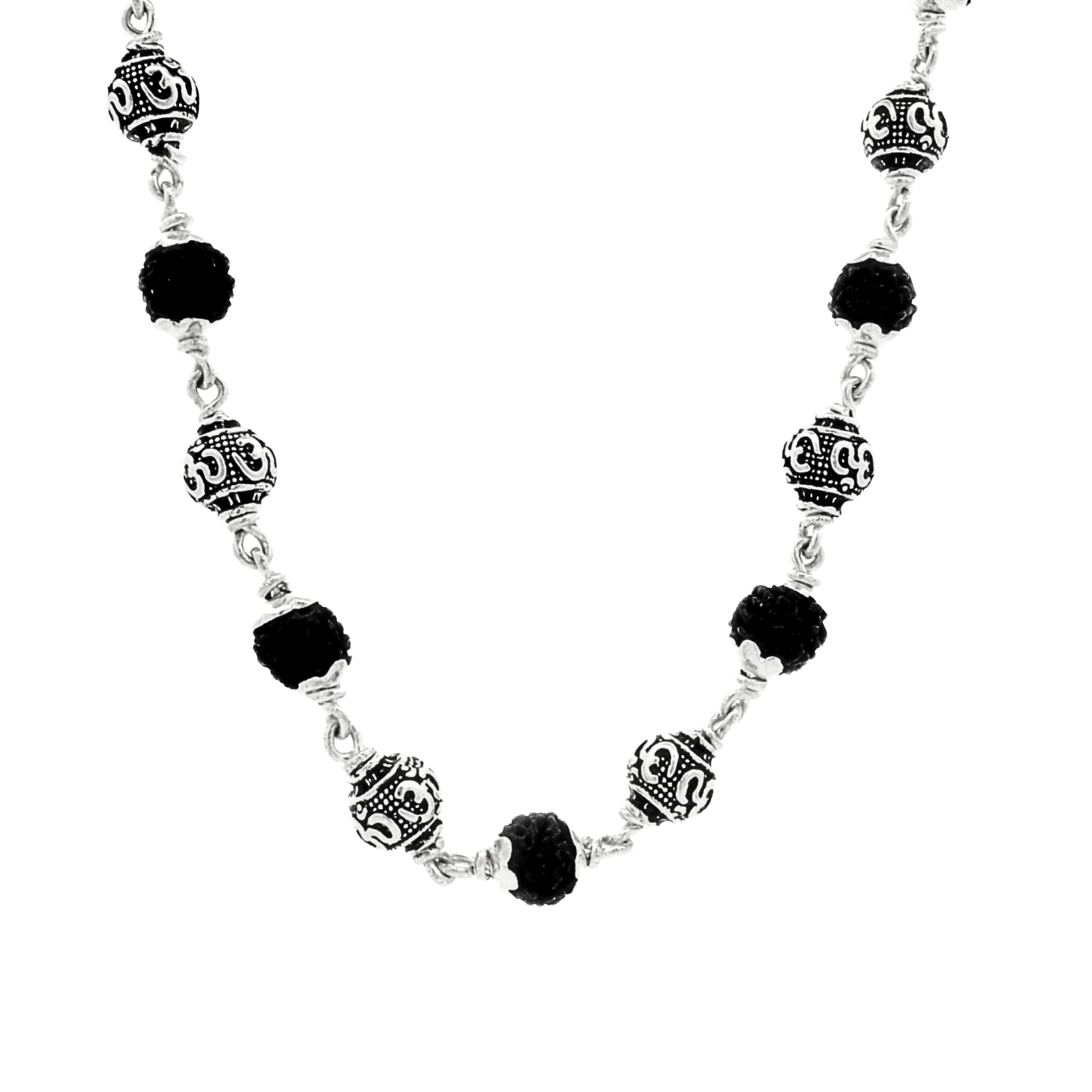 A sacred Om Rudra Mala Necklace with Oxidised Silver OM Beads, designed to represent divine vibration, spiritual protection, and inner harmony. The combination of natural Rudraksha beads and OM symbols creates a meaningful spiritual accessory.
