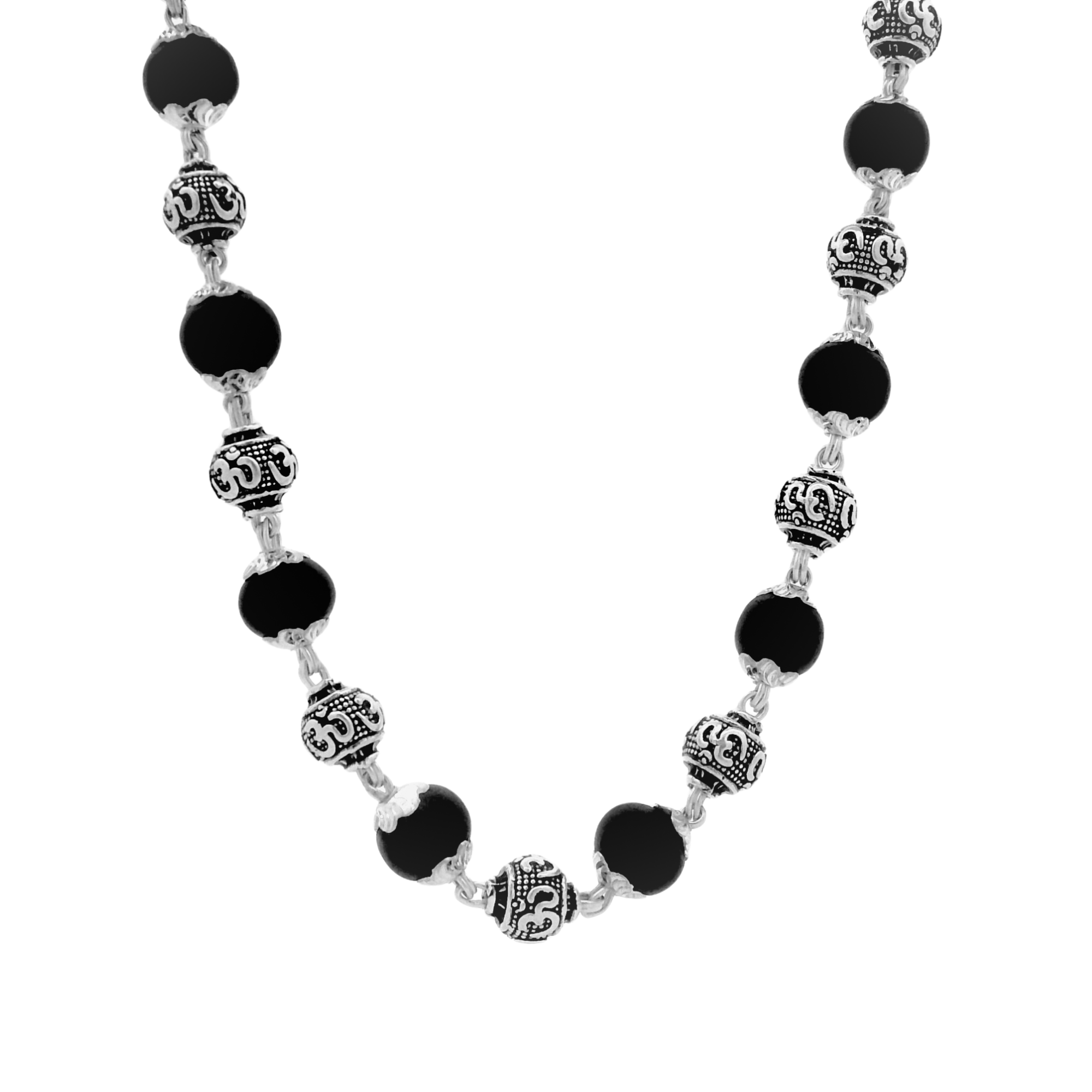 A spiritually powerful Om Karungali Mala Necklace with oxidised silver Om beads, designed to symbolize protection, positivity, and divine energy. The combination of sacred Om symbols and Karungali beads creates a meaningful spiritual accessory.