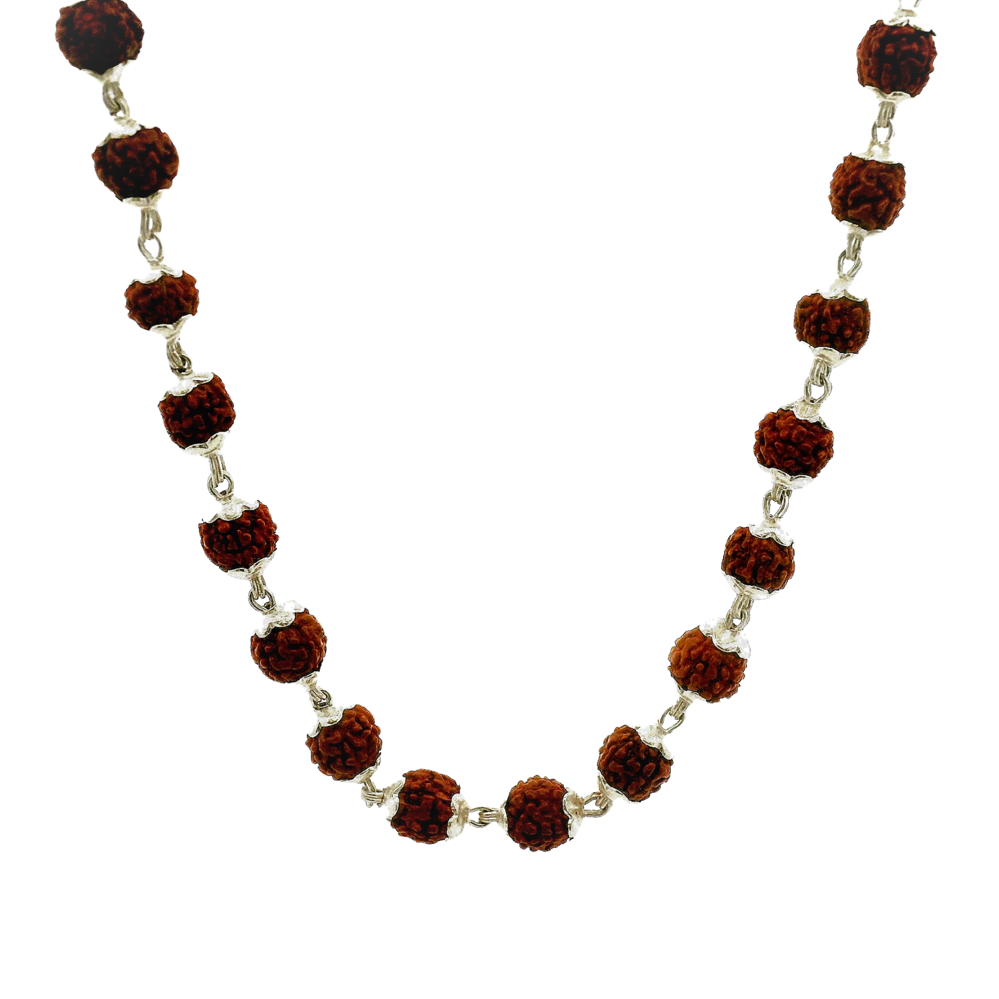 A sacred Kailash Rudraksha Mala crafted with natural round Rudraksha beads and elegant silver spacers, symbolizing divine protection, spiritual strength, and blessings of Lord Shiva.