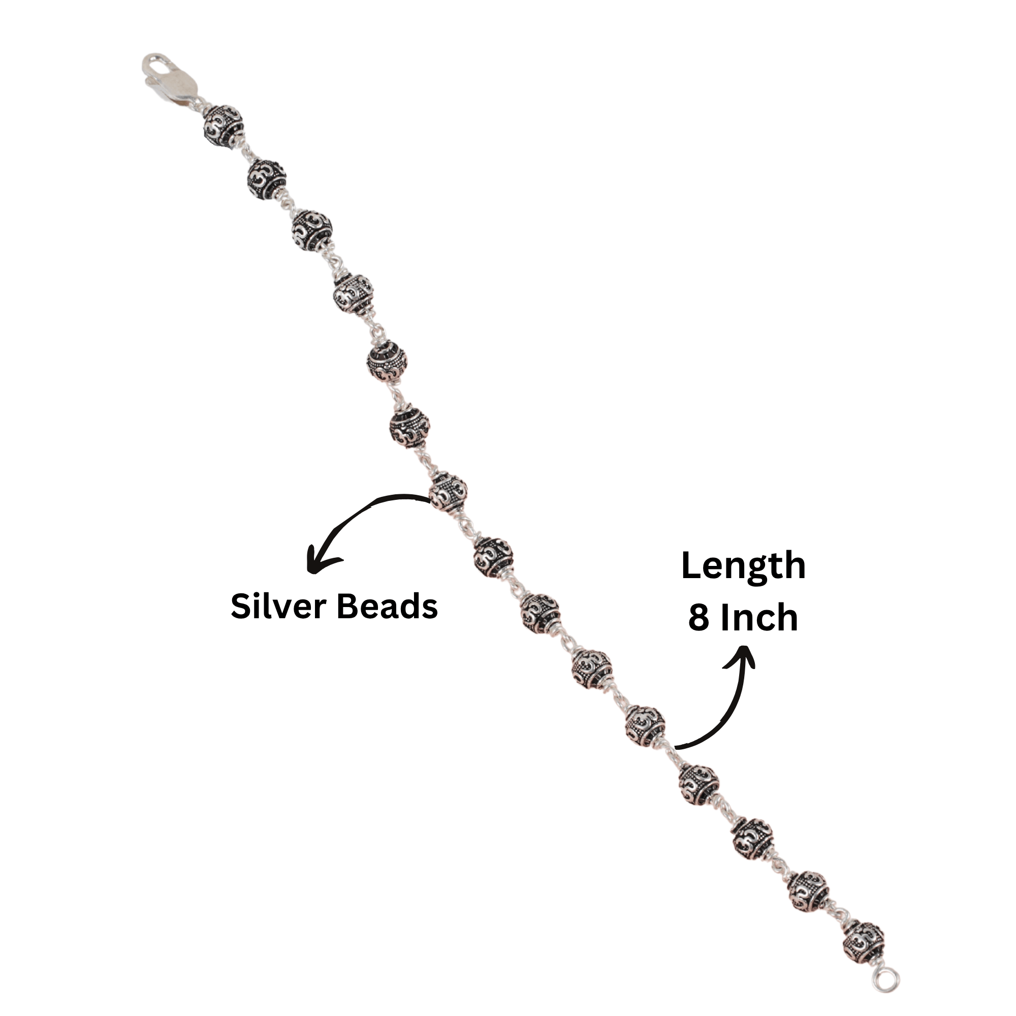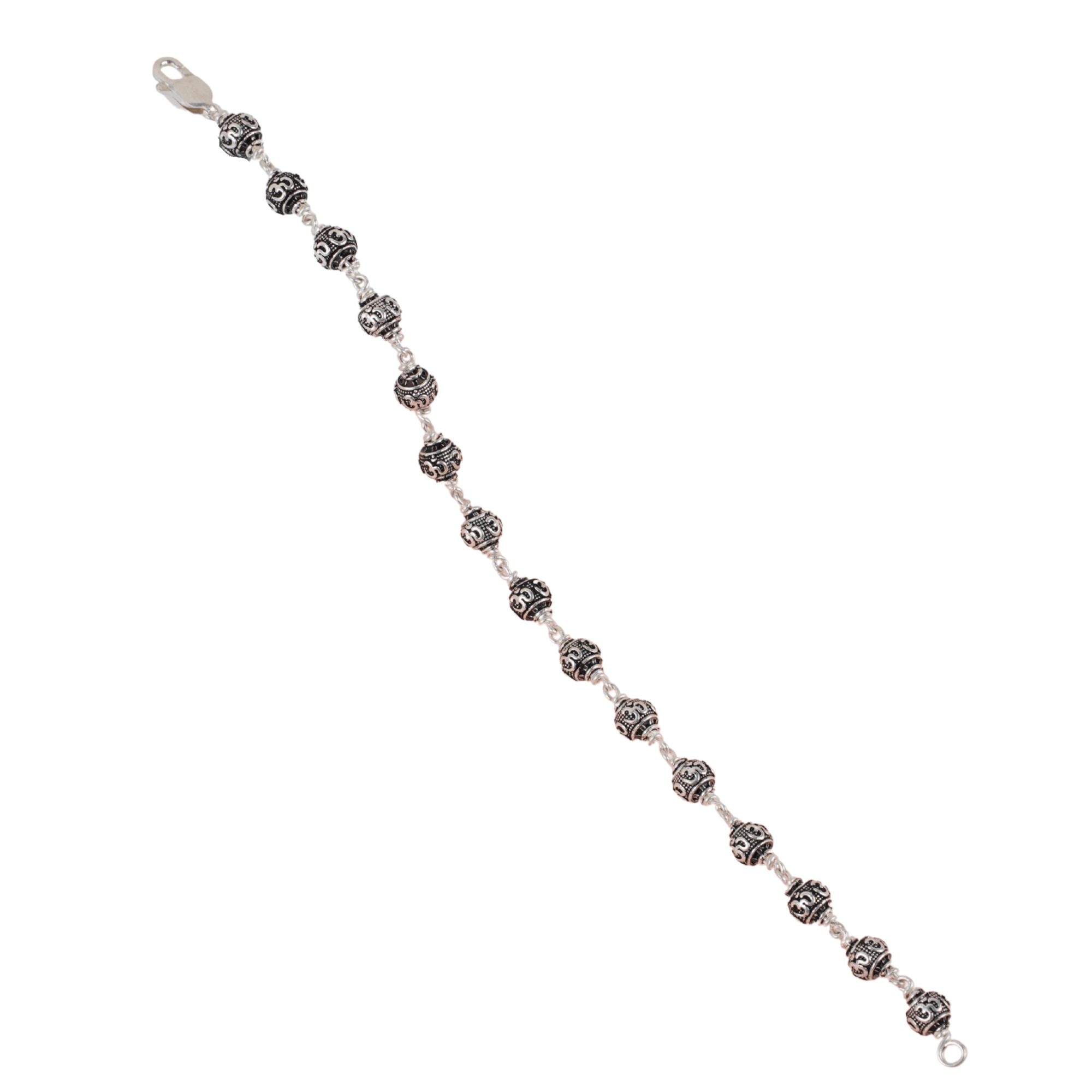 A Om Engraved Silver Bracelet featuring intricately carved silver beads, designed for spiritual elegance and everyday wear.